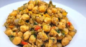 Freshly boiled chickpeas soft and seasoned with freshly chopped tomatoes, green onions, onion, garlic and spinach