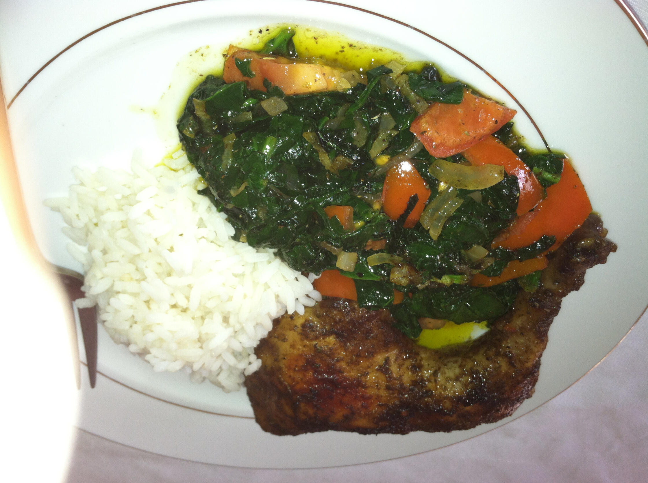 Freshly chopped spinach stewed in olive oil and garlic, tomatoes, onions, chives, and celery.Jerk Chicken: Chicken marinated in house jerk sauce and baked until tender with a rich caribbean flavor